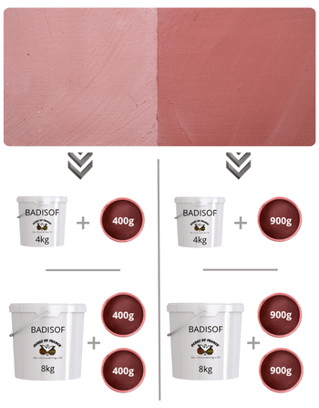 Results of Rouge cassis mixtures according to our packaging, in our limewash Badisof naturel