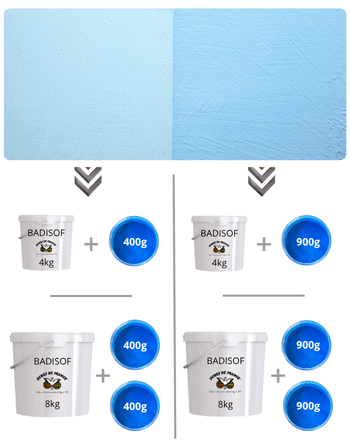 Résultats de mélanges de Bleu charrette selon nos conditionnements, dans notre badigeon de chaux Badisof naturel