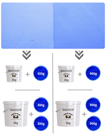 Résultats de mélanges de Bleu outremer selon nos conditionnements, dans notre badigeon de chaux Badisof naturel