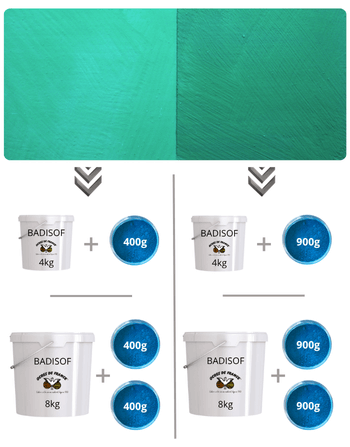 Résultats de mélanges de Bleu canard selon nos conditionnements, dans notre badigeon de chaux Badisof naturel