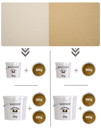 Coloris : brun moyen tirant sur le jaune avec un liant transparent. Beige un peu jaune avec un liant blanc.